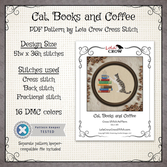 Cat, Books and Coffee - Digital PDF Cross Stitch Pattern