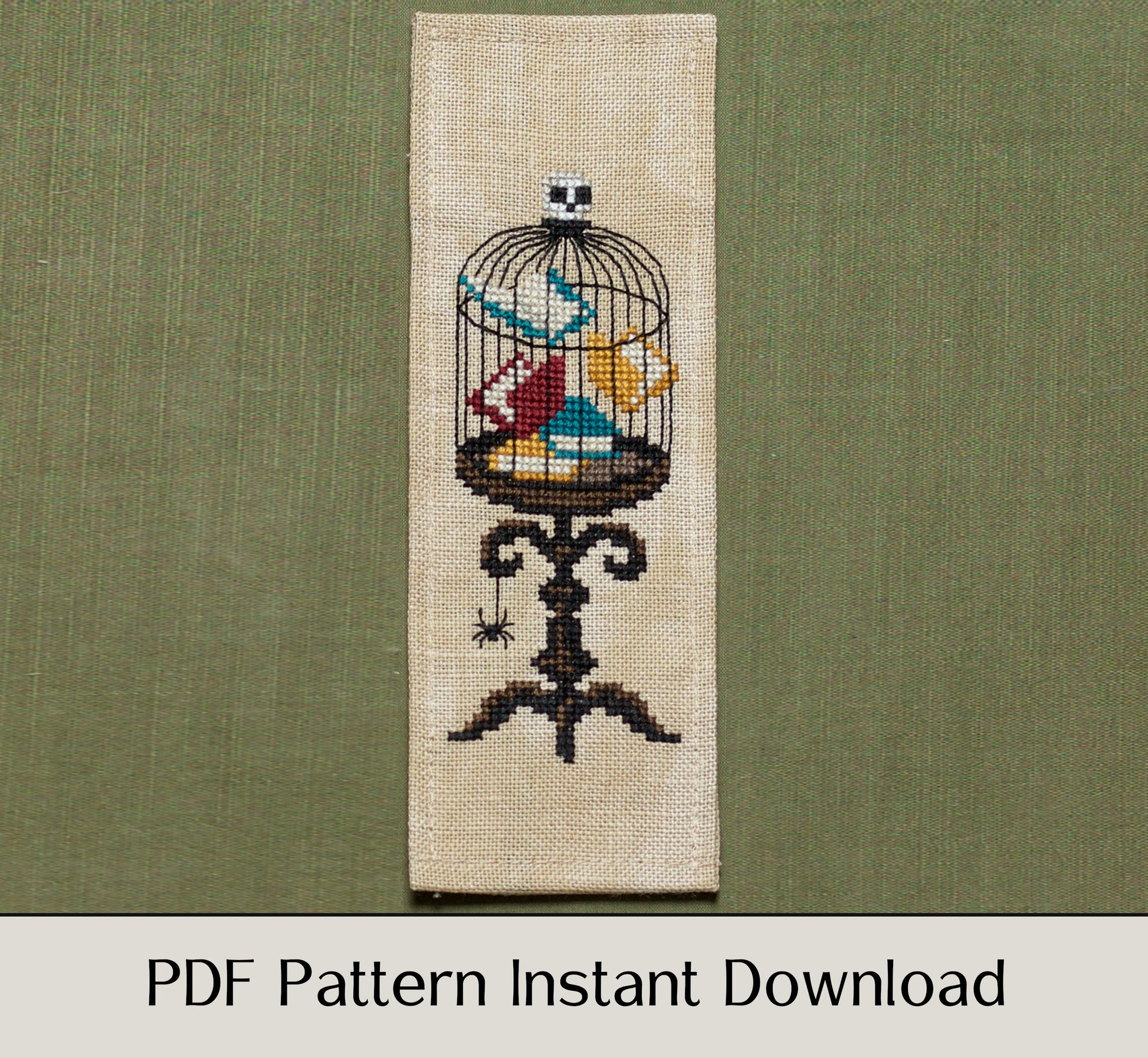 This bookmark pattern will assist with all your spooky reading. It features a birdcage filled with enchanted books. The pattern was originally designed as a companion piece to the Haunted Library. The detailed back stitching makes this cross stitch pattern most suitable for stitchers with some previous experience.