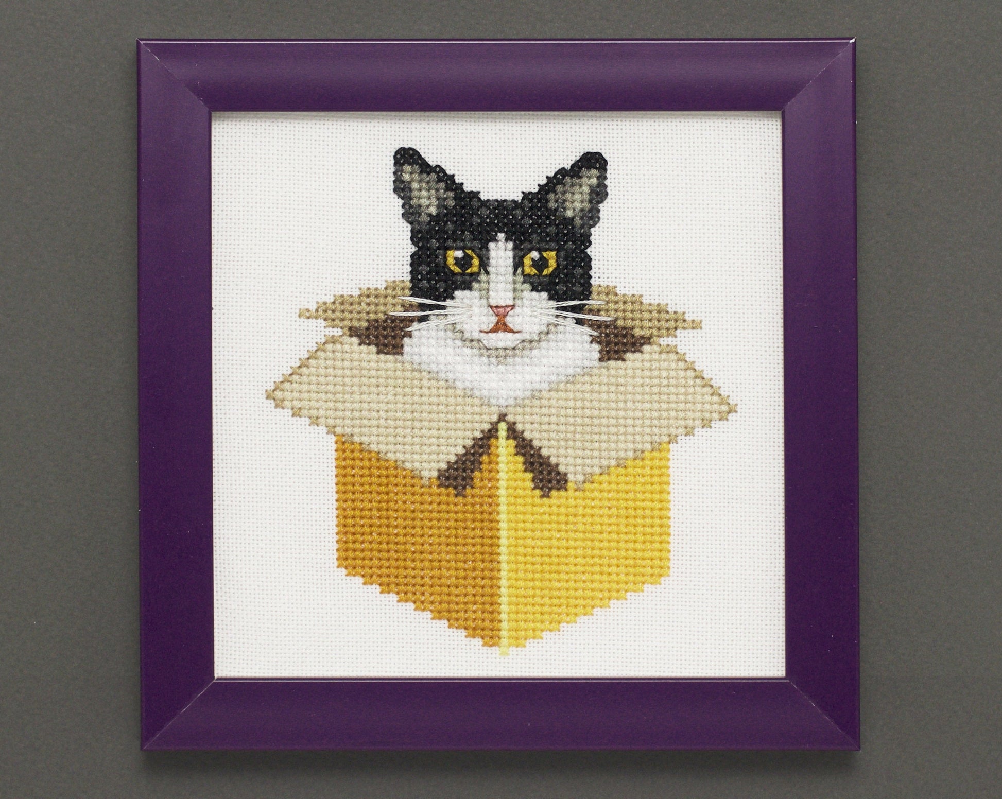 It's just a cat in a box and all the adorable charm that goes along with that phenomenon. This cross stitch pattern has some back stitching, 3/4 stitches, detail work and many colors, so it is best for more adventurous beginners or experienced cross stitchers.