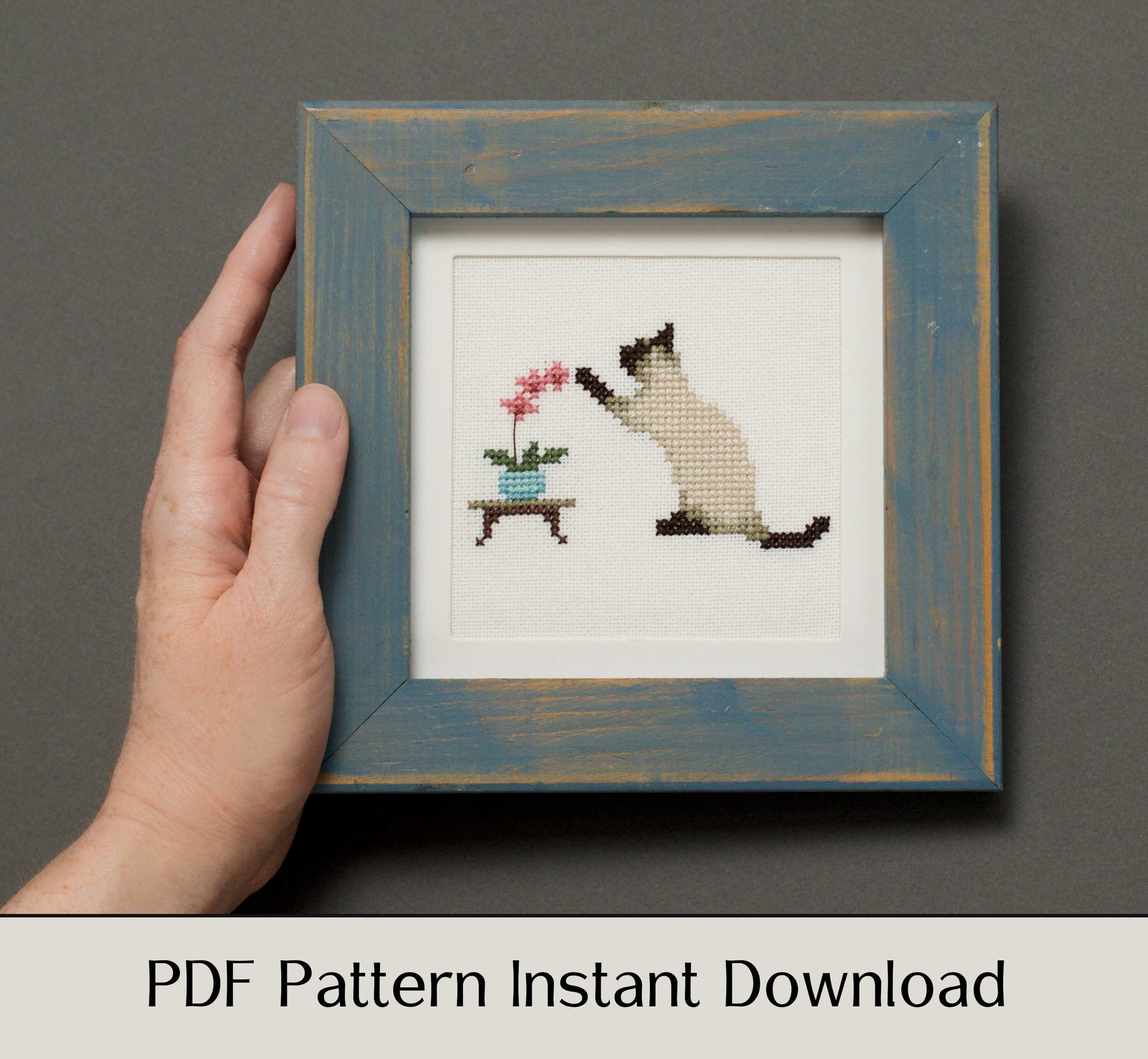 What's more homey than cats and houseplants? This sweet siamese cat touching a blooming orchid is easy to stitch and a fun project for both beginners and experienced cross stitchers.