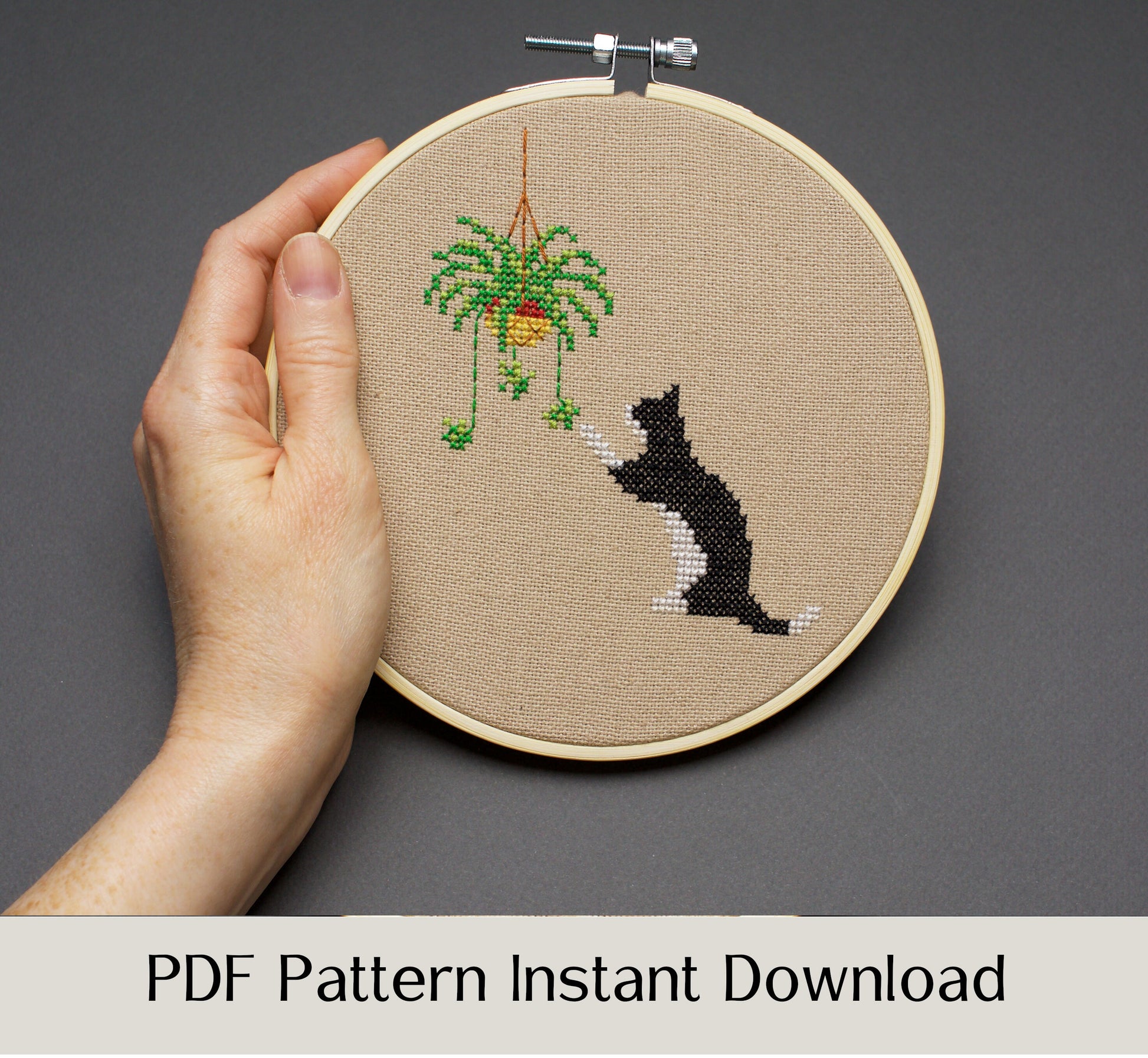 What's more homey than cats and houseplants? This sweet tuxedo cat touching a spider plant is a quick stitch and a fun project for both beginners and experienced cross stitchers.