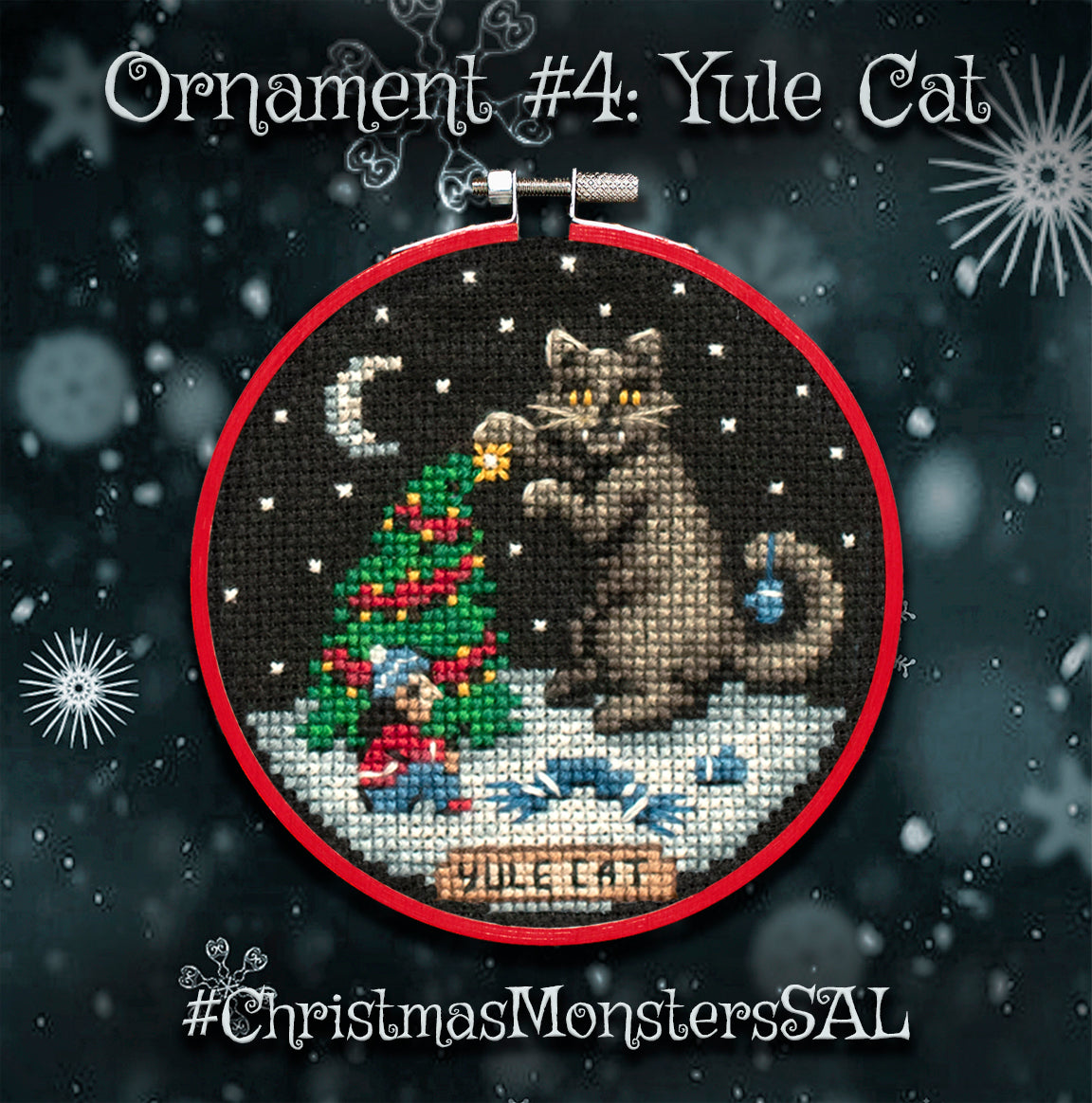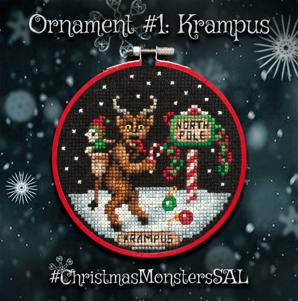 This set features four ornament patterns (and a fifth bonus pattern), each with a different legendary Christmas monster in a whimsical holiday scene. The ornaments may be stitched independently or grouped together using the included stitched frame.