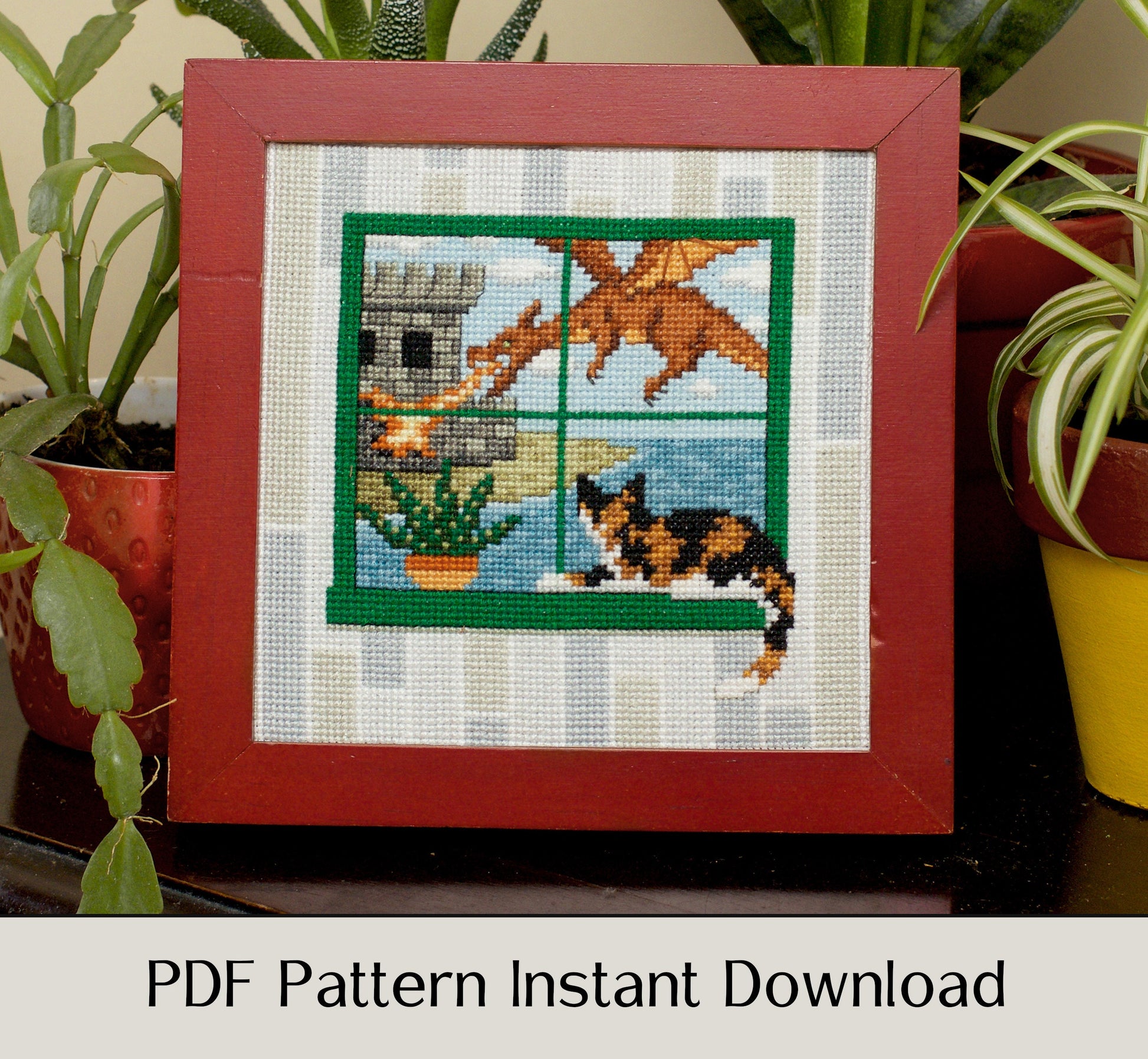 What does the cat see when she spends the whole day staring out the window? This cross stitch pattern offers a fanciful answer. The fourth in the "What the Cat Saw" series, "Flight of Dragons" imagines a fantasy dragon and castle scene just outside the window as a calico cat lazily lounges alongside a houseplant. This is a full-coverage piece with many colors and significant back stitching details, so it is most suitable for those with some cross stitch experience or the more adventurous beginners.