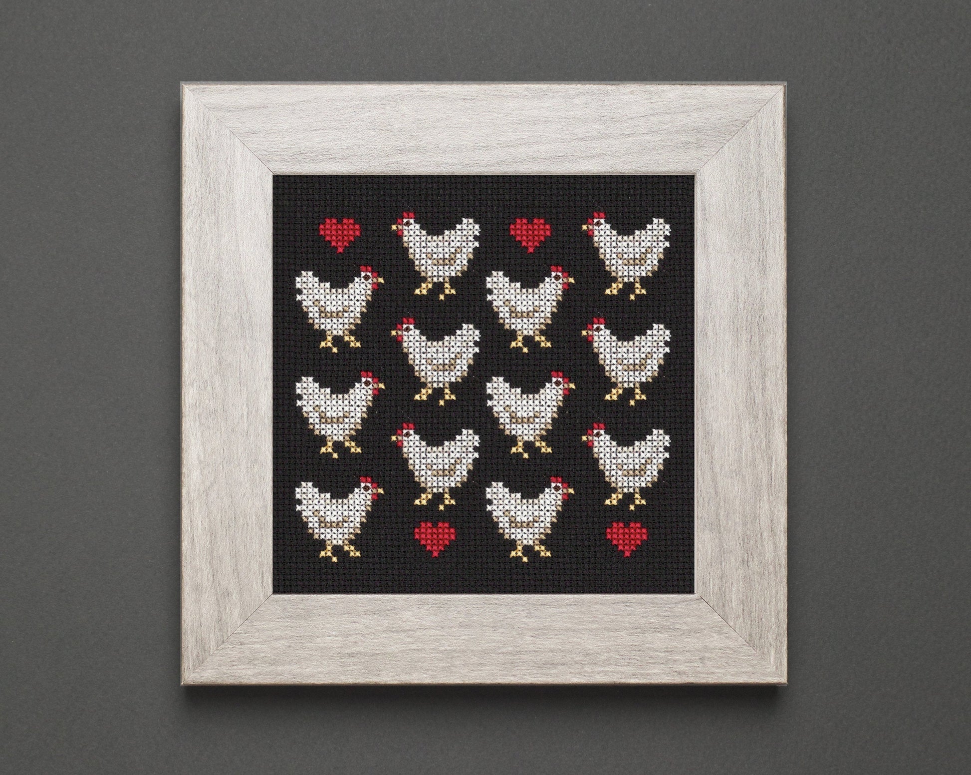 This one is for all the chicken enthusiasts! A cute chicken and heart sampler, with a modern flair. This one is easy to stitch and a fun project for both beginners and experienced cross stitchers.