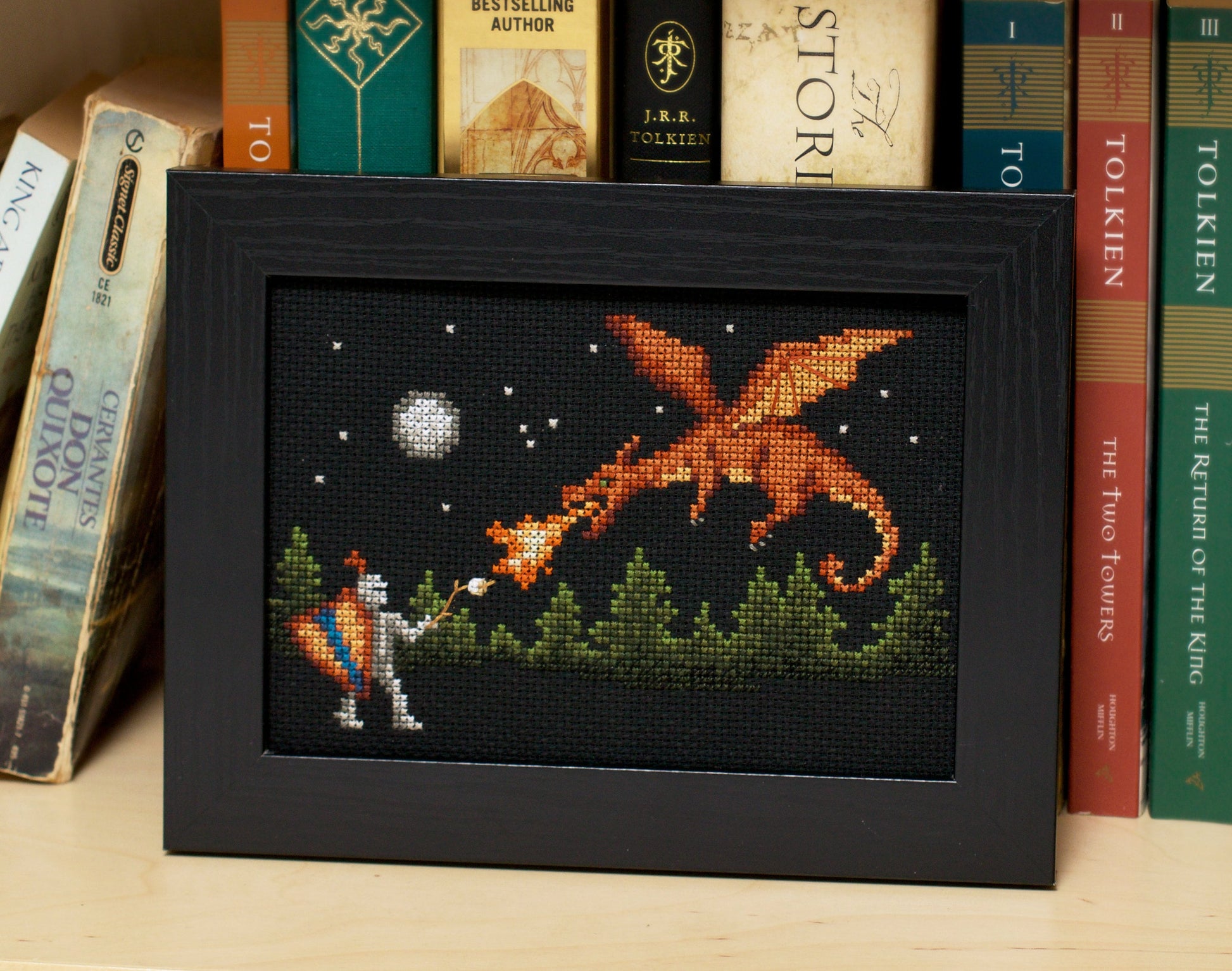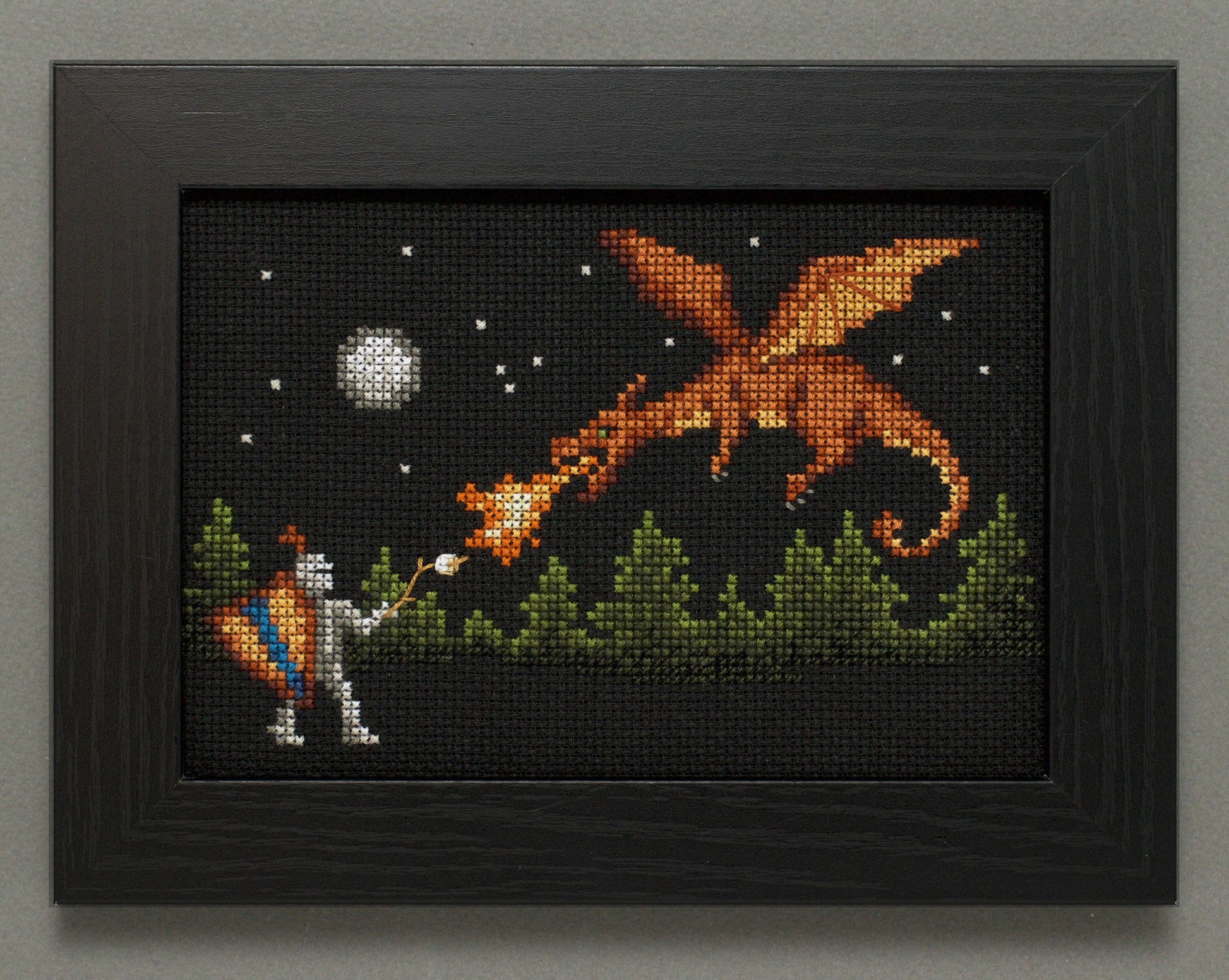 If you love camping and fantasy, this is the cross stitch pattern for you! Why should the knight slay the dragon, when they can make s'mores instead? This is an easy pattern with mostly whole cross stitches and some minor backstitch details, great for both beginners and more experienced cross stitchers.