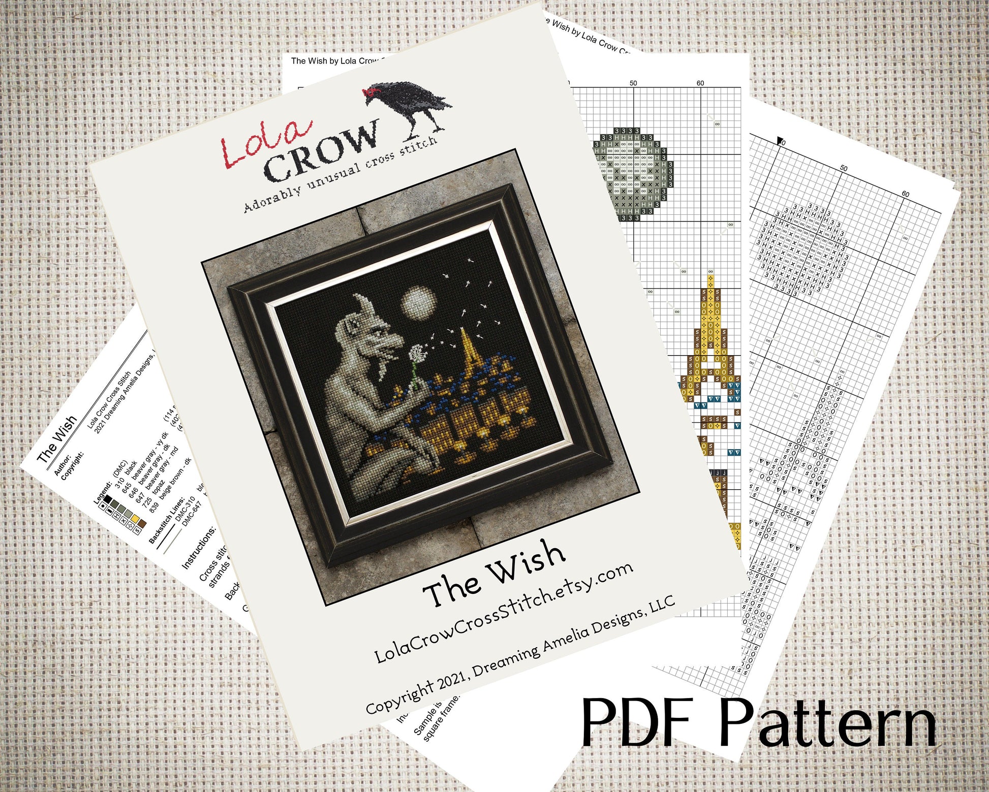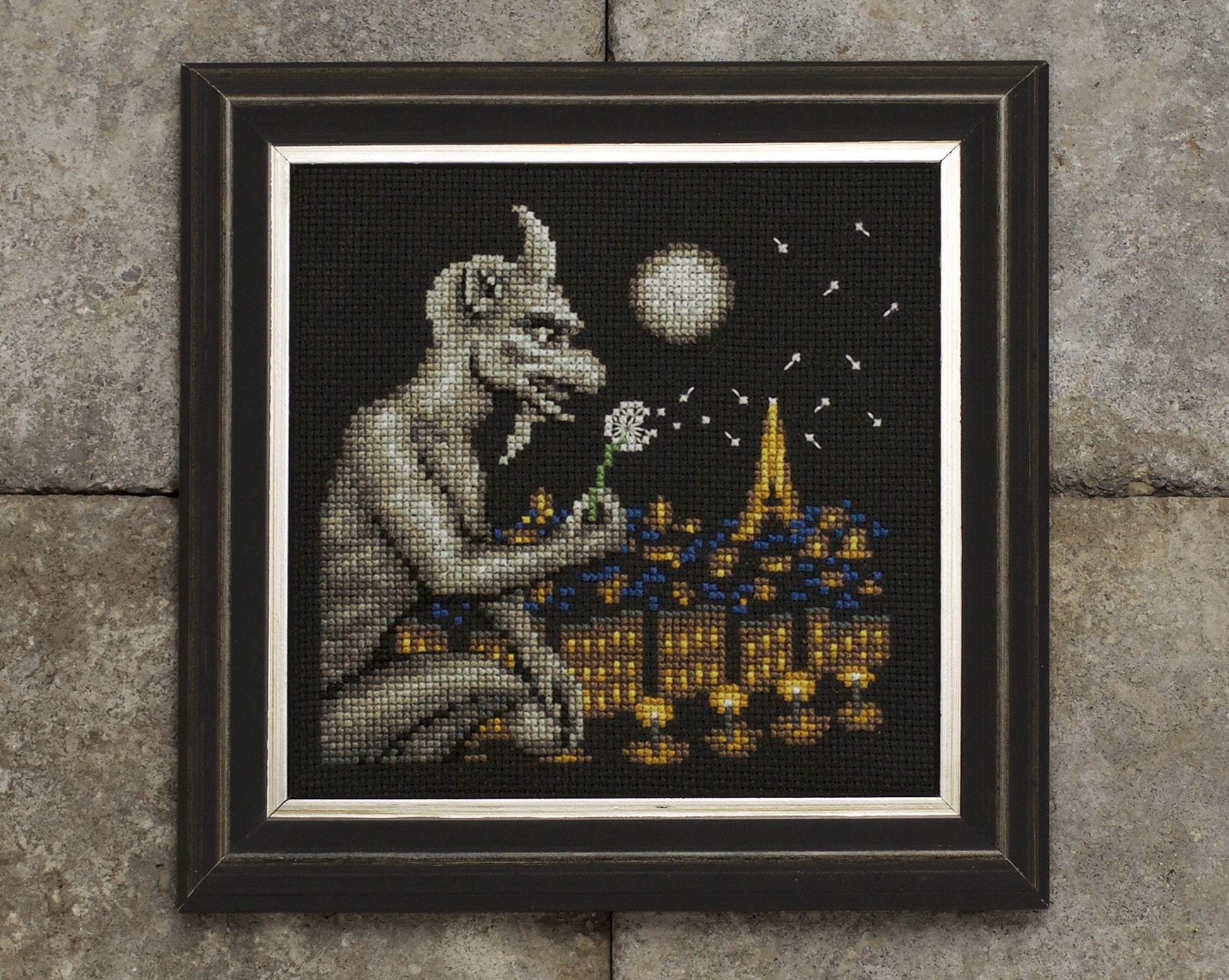 What wishes do gargoyles make on dandelion puffs? This pattern features a gargoyle scattering dandelion seeds across the Paris night sky. For best results, it should be stitched on black/dark cloth. There is minimal back stitching, however the blending of multiple shade of gray and many scattered, isolated stitches make this pattern more suitable for cross stitchers with some experience.