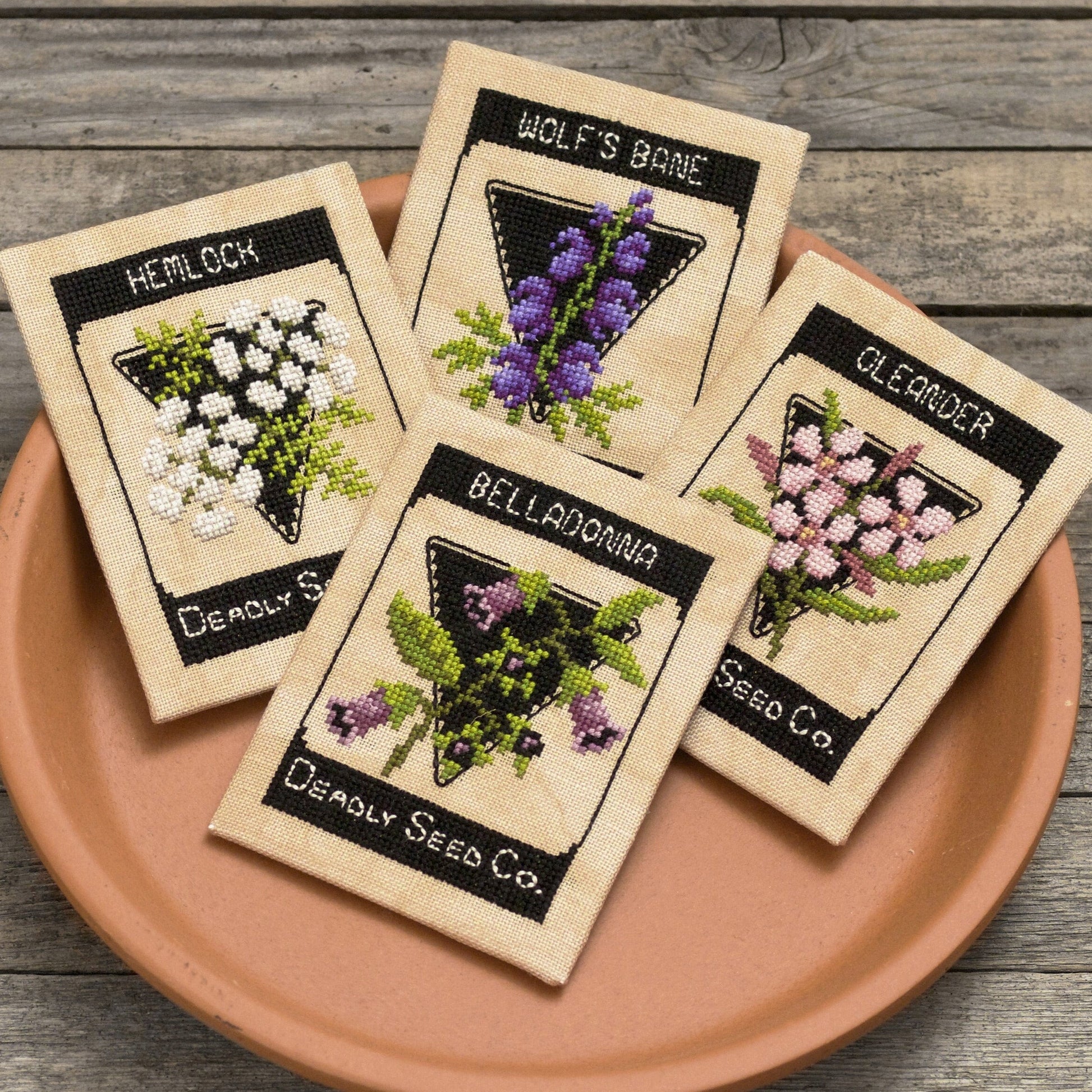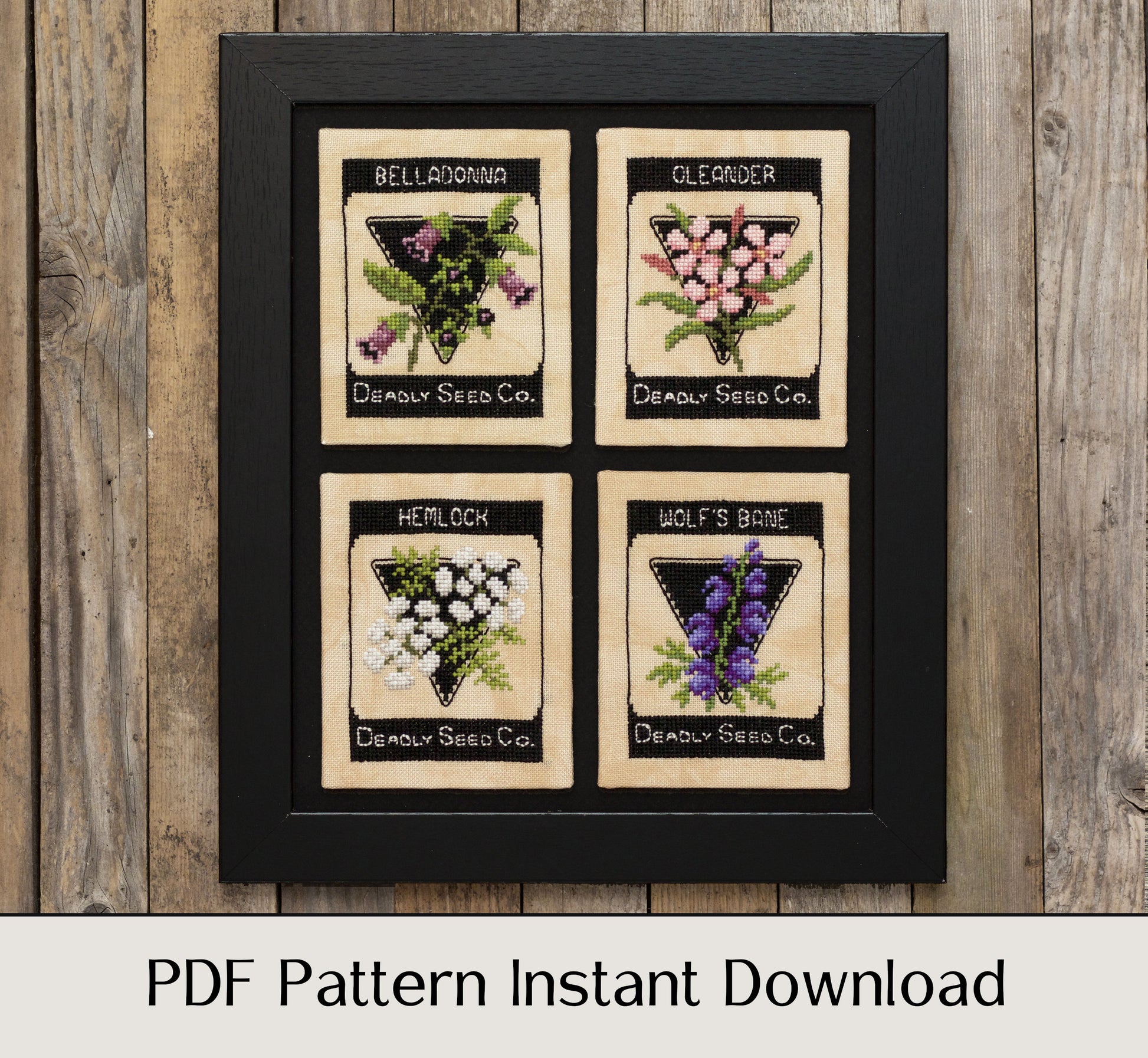 You won't see these seed packets in any catalog. This cross stitch pattern features four patterns of deadly plants on vintage seed packets. Included are the poisonous plants Belladonna (deadly nightshade), Oleander, Hemlock and Wolf's Bane. Stitch them as a group or individually. The pattern is most suitable for cross-stitchers with some experience because of the back-stitching details.