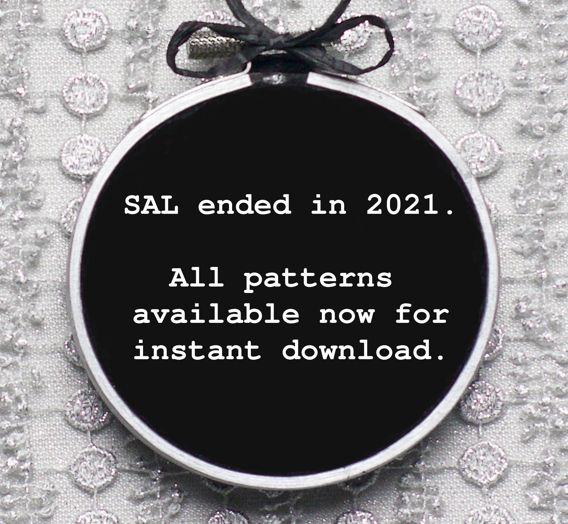 The stitch-along ended in December 2021, but the ornament patterns are still available as a complete set. This listing includes includes five ornament patterns plus a bonus miniature pattern. Each pattern features a different cryptid creature in a Christmas-themed scene as follows:
