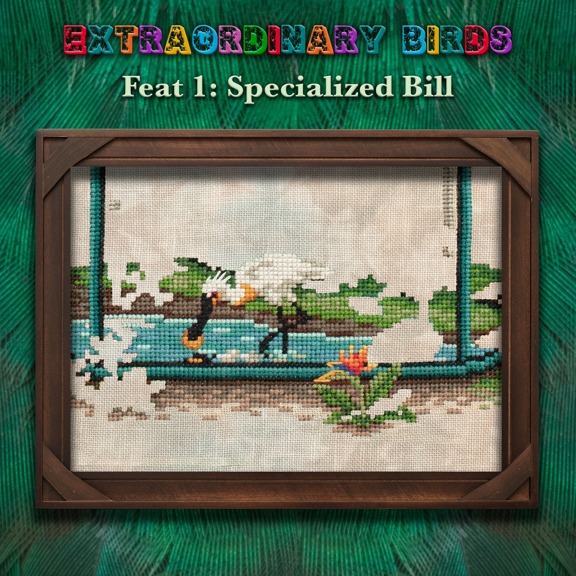 This cross stitch pattern features an aviary filled with strange and incredible birds. The design highlights different feats of the avian world and includes an index with information about the featured creatures. All of the animals in the aviary represent real species (living and extinct).
