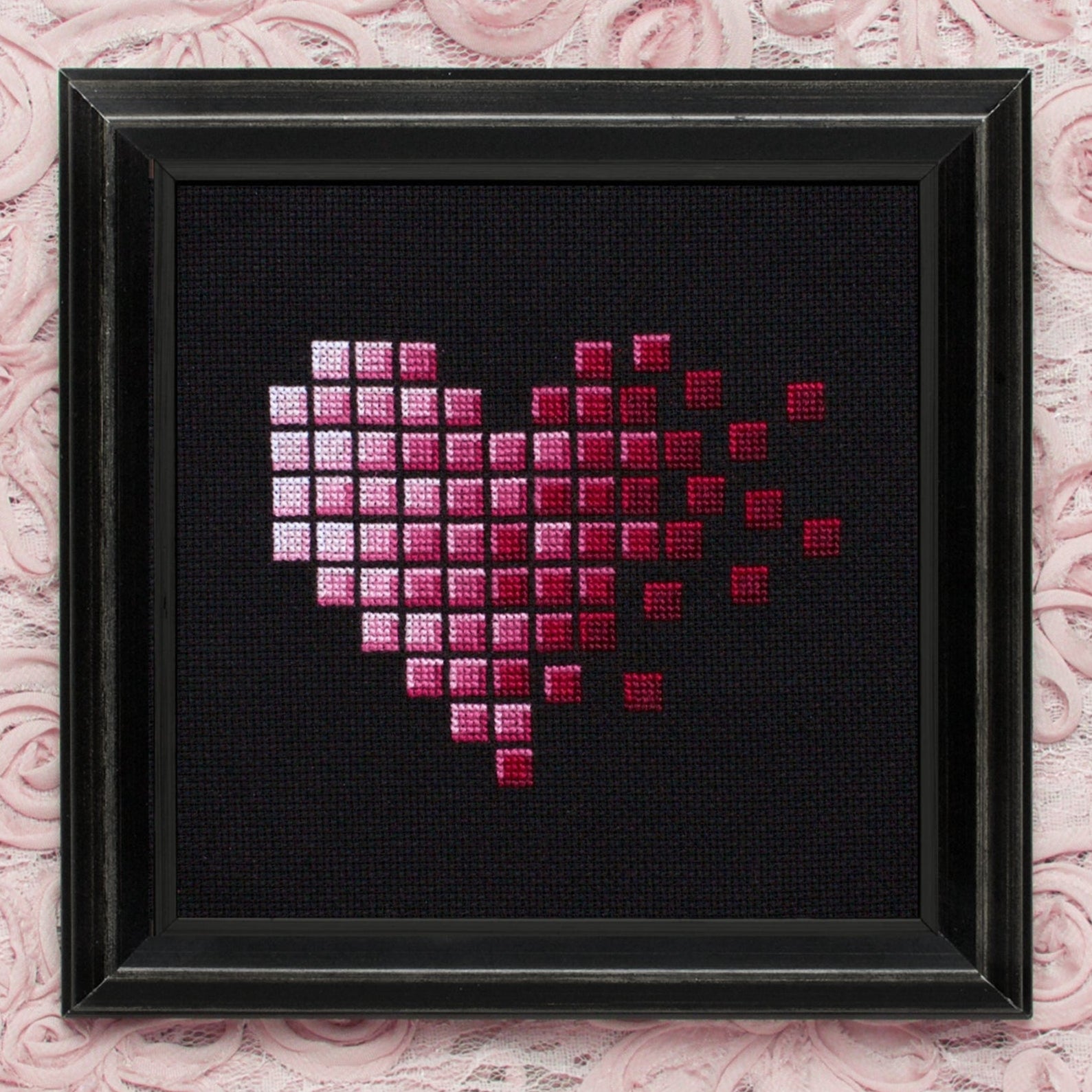 This geometric cross stitch heart evokes the look of mosaic tiles that fade from white to burgundy as they float away. It is an easy pattern with a lot of impact, great for both beginners and more experienced cross stitchers. Full cross stitches only.