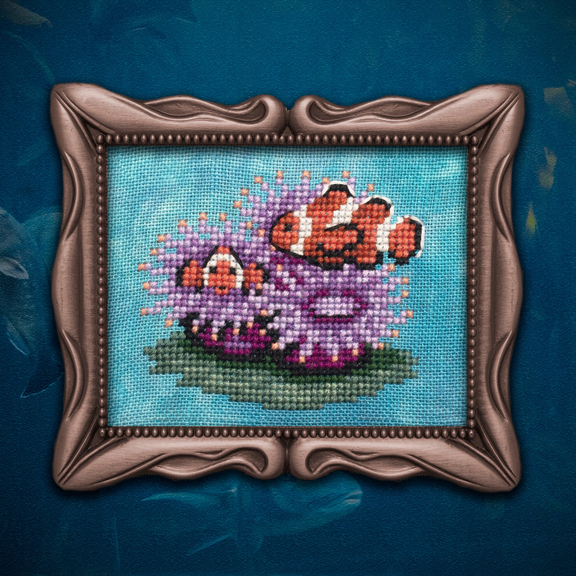 Clownfish and anemones are best buddies in this cute little cross stitch design. It is an easy pattern for both beginners and experienced cross stitchers and has a small amount of backstitch.